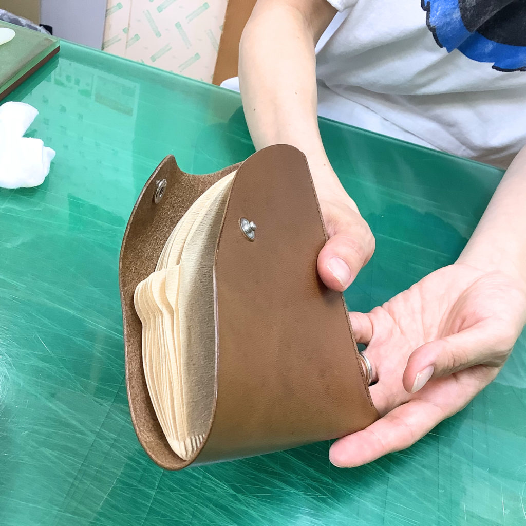 現在ワークショップでは、キーホルダー・小銭入れ・パスケース・ブックカバーの4種類を作ることができます。コーヒーフィルター入れは定番ではありませんが、構造的にシンプルなので、ワークショップで作ることになりました(型紙を作ったので、作りたい方はぜひ)。