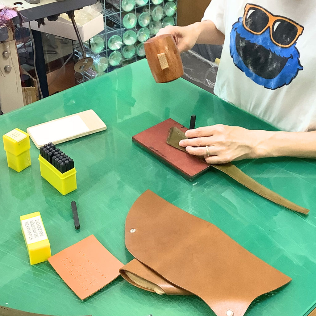 事前に革の色はモカとお聞きしていたので、裁断済みの革に刻印を入れることからスタート。練習用の革を使って手打ち刻印の練習をしてから本番に臨みます。