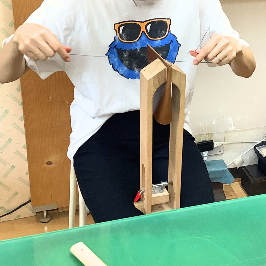 穴あけの後はいよいよ手縫いワークショップの醍醐味である「縫う」作業です。革を固定して縫いやすくする道具・レーシングポニーを使ってひと穴、ひと穴縫っていきます。