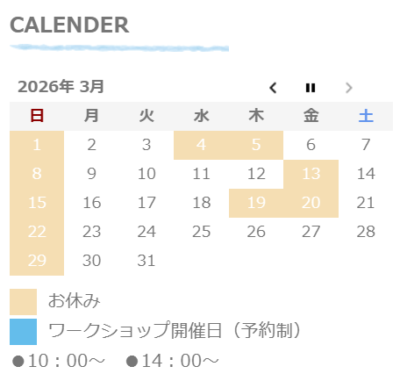 私用のため、平日のお休みが数日あります。ご来店の際は営業日のご確認をお願いいたします(外出することもありますので、お電話でご来店の日時を連絡いただけると助かります)。